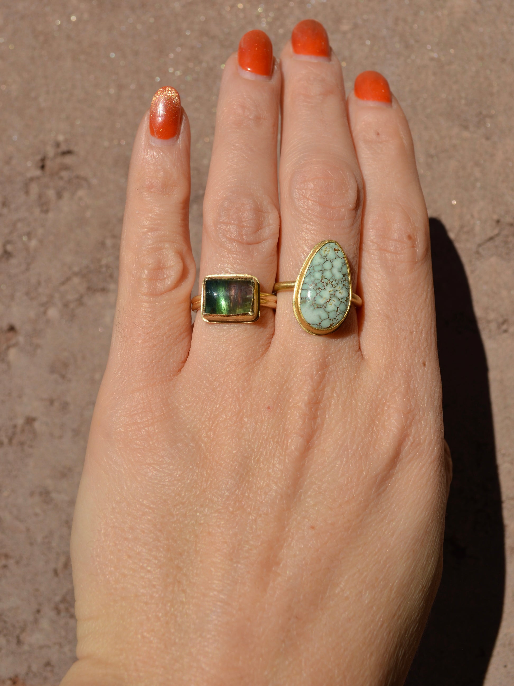 This beautiful bicolour tourmaline fades from watermelon pink to green. I love the ancient feel of this piece, just waiting to be part of somebody's adventures. Set in a lovingly handcrafted, one-of-a-kind, silky 18k gold setting and double style ring shank.
